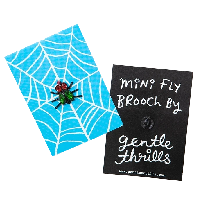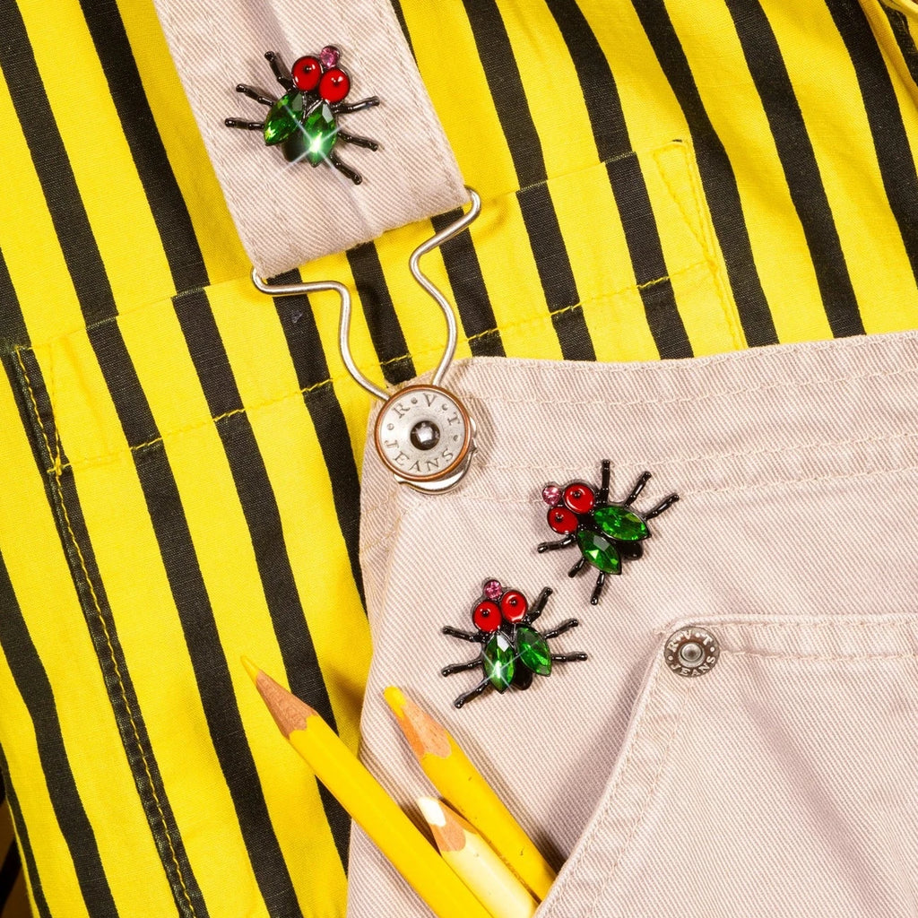 A gorgeous, glamorous, and bedazzled fly for your lapel! This brooch features black enamel metal with emerald and bubblegum jewels and a single post with a black rubber clasp Measures approximately 1" wide x 3/4" tall