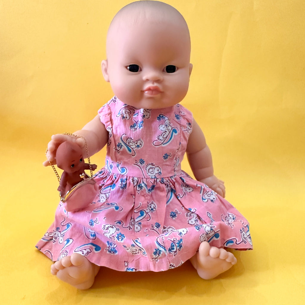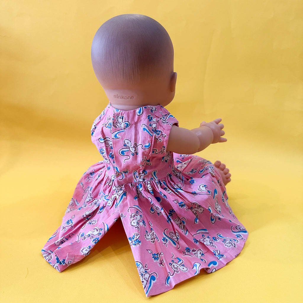 Vintage handmade pink duck print doll dress. Snap closure on back