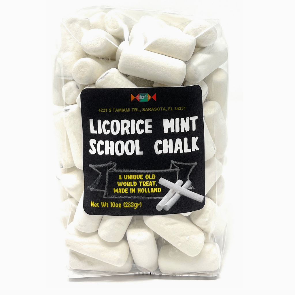 Bagged Imported licorice peppermint Licorice. Licorice chalks have a crusty mint exterior with a delicious dark licorice interior. They are so refreshing and make a fine and classy candy favor or snack.