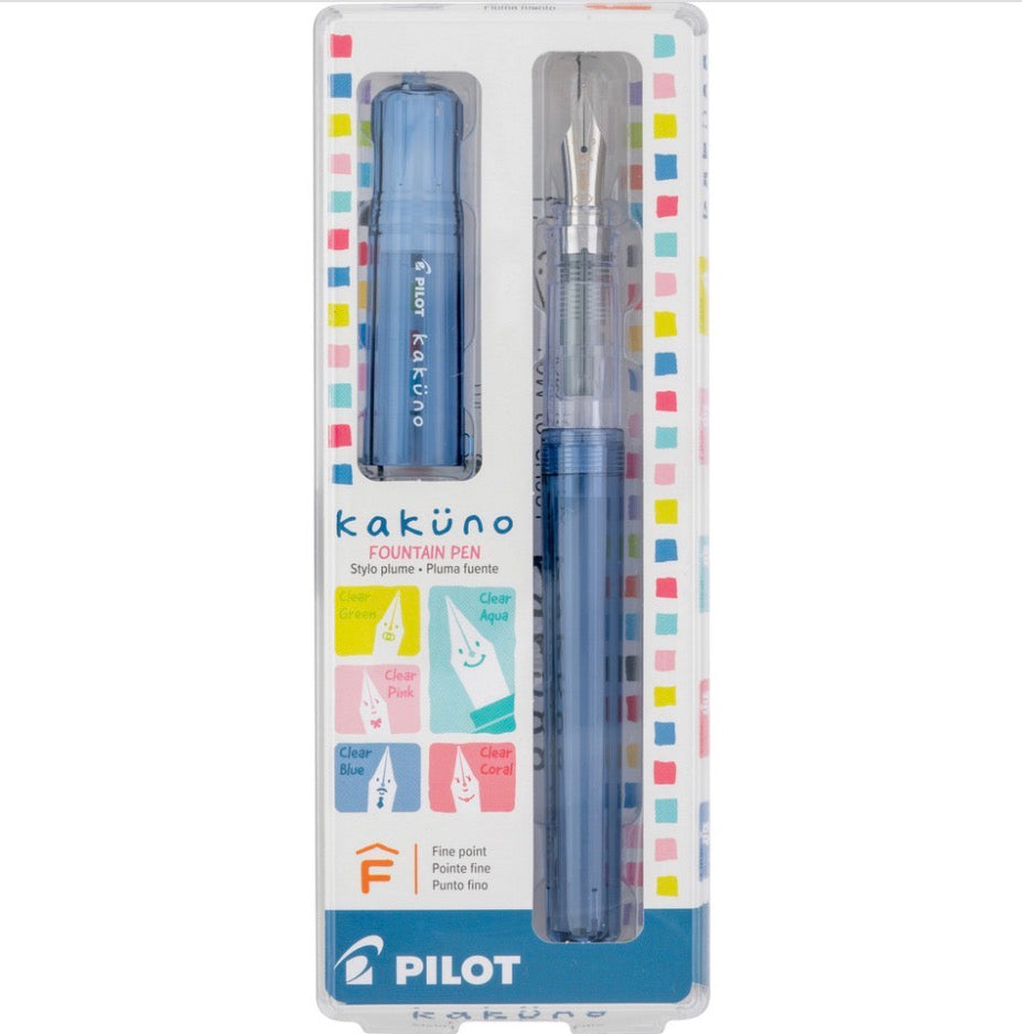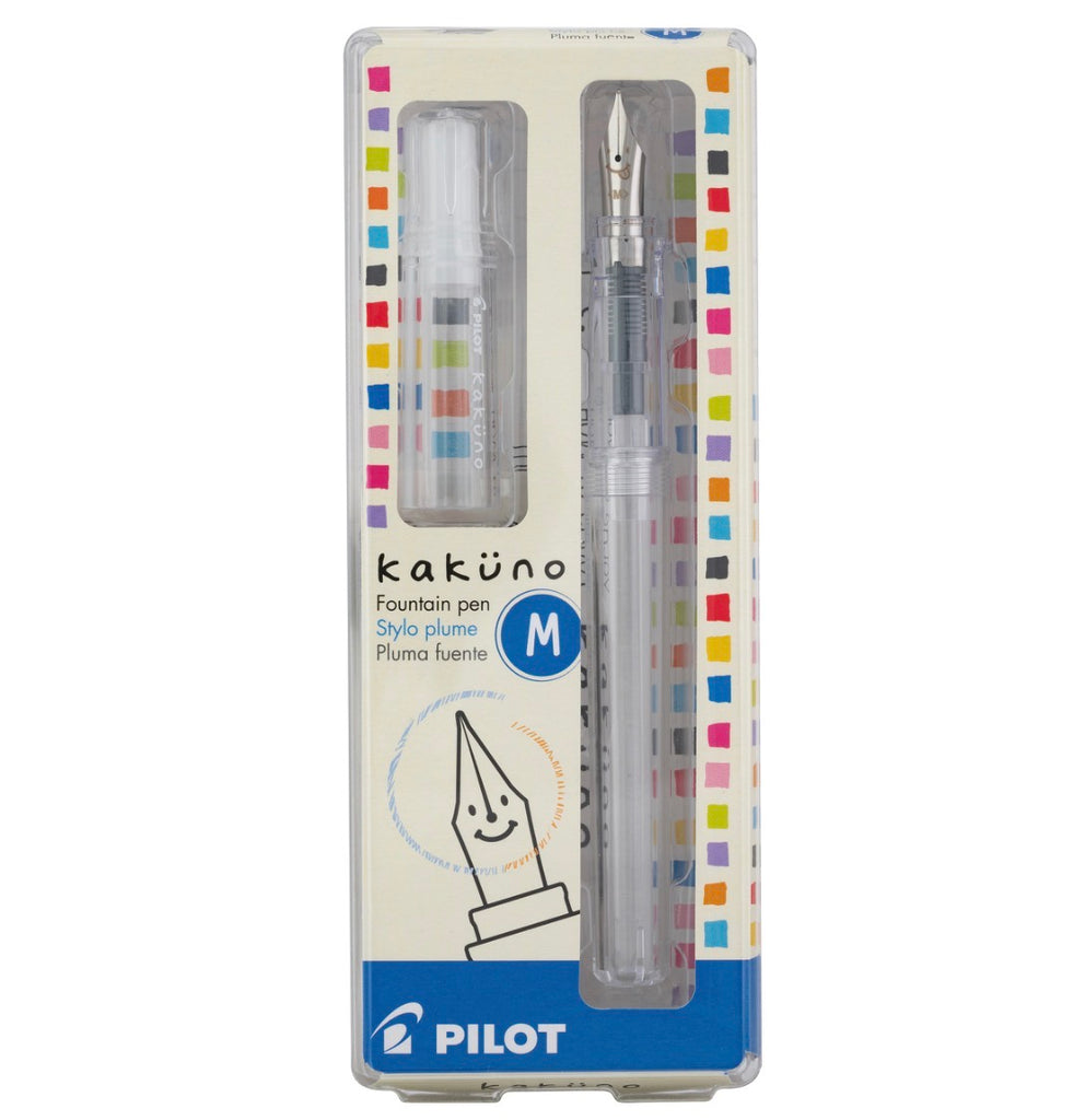 Kakuno is a delightful, new fountain pen that is ideal for both first time fountain pen users and experienced writers. Everyone can enjoy writing with a Kakuno fountain pen. "Kakuno" means "to write" in Japanese, and that's just what this pen helps users to do by featuring an appealing smiley face on the nib, when oriented upward, ensures perfect nib orientation. The pastel capped white barrel pens feature the Fine Nib (with a winking smiley face) while the primary color capped gray barrel options feature the Medium Nib (with a traditional smiley face). Indentations in the cap make it easy to grasp when uncapping the pen. The cap and body are hexagonal, similar to the classic wooden pencil, so that the pen is comfortable to hold and doesn't roll away. Novices will soon be on their way to becoming seasoned fountain pen users, and seasoned users will enjoy the fun, exuberant writing the Kakuno fountain pen delivers