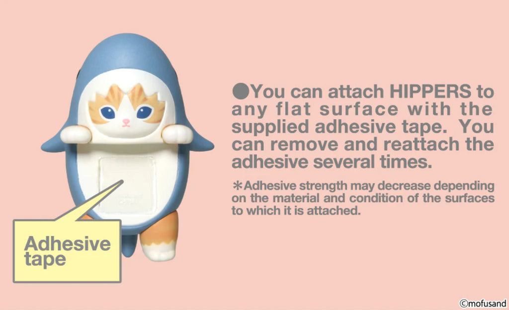 Each cat’s belly has a strip of removable adhesive tape attached. By peeling off the release paper, you can attach your HIPPER to devices like computers and smartphones or decorative items like pen holders and photo frames.