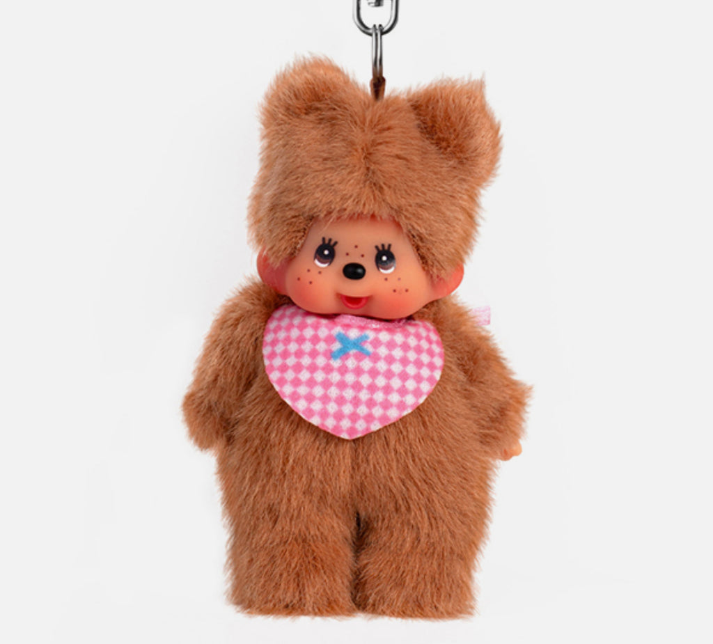 Carry your new fave cuddle buddy wherever you go with this Monchhichi keychain featuring a little Bearchichi dressed with a sweet little bib. Topped with a metal keyring to easily carry your plushie with you. Made by Sekiguchi of Japan.