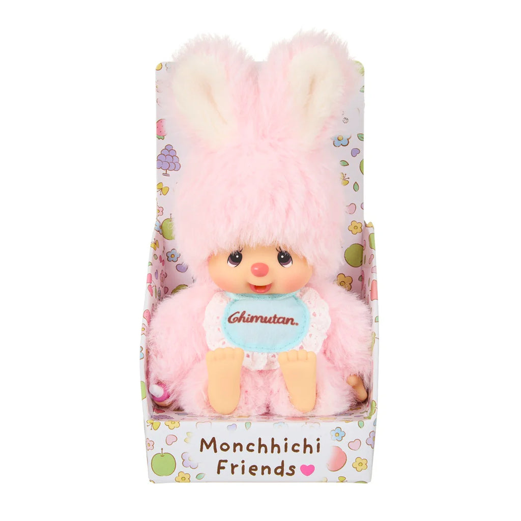 Chimutan is a bunny character in the Monchhichi world- Monchhichi’s best friend! This pink bunny is the SS or mini size, and is about 6” tall. She wears a cute blue bib with lace trim and can suck her pacifier. Made by Sekiguchi and imported from Japan