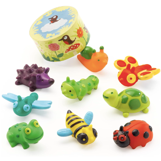 - CONTENTS - 9 soft-touch plastic figures (butterfly, ladybird, bee, snail, hedgehog, frog, caterpillar, tortoise, dragonfly), 1 cardboard box, and 30 flower tokens. Game rules in 10 languages.