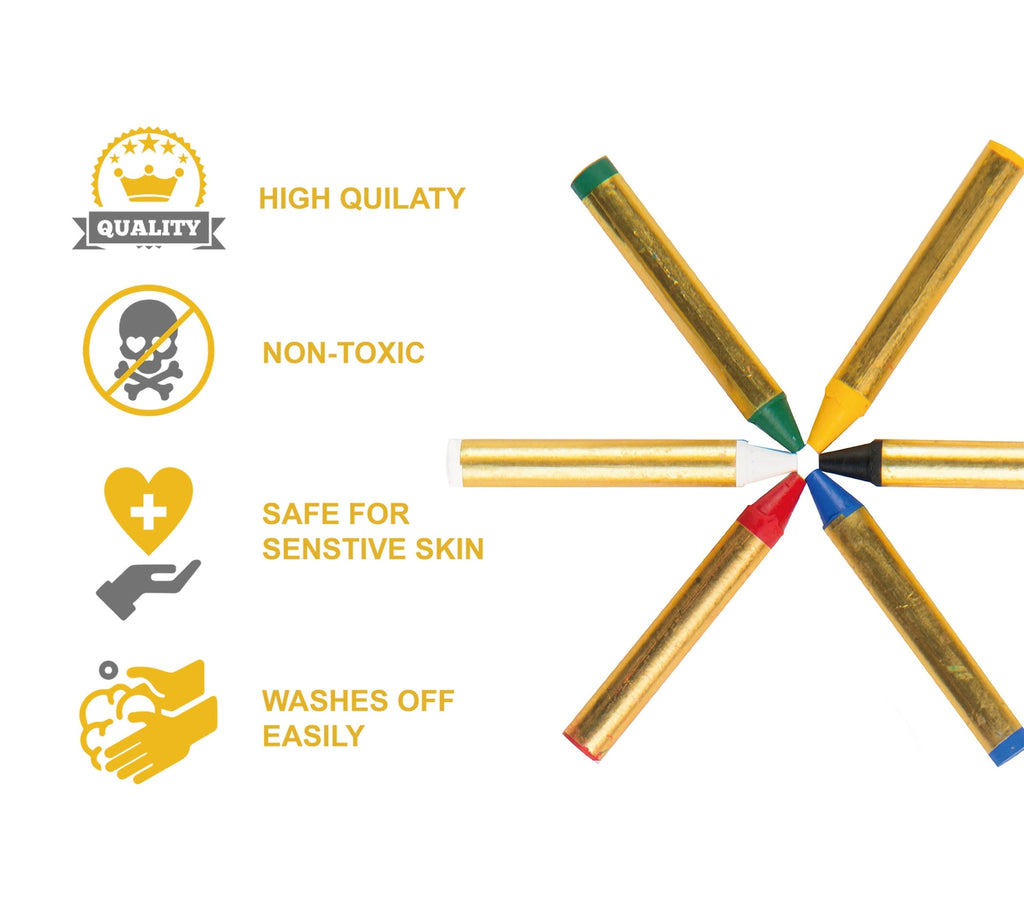 Bring Your Imagination to Life – These kids’ face paint set features 6 colors. Perfect for creating endless designs and characters. Perfect for Little Hands – Each crayon measures 2.5 inches, making them just the right size for kids to hold and use comfortably. Fun for all ages, including adults! Safe and Effortless – Made with non-toxic materials, these face paints are skin-safe, easy to apply, and simple to wash off. Just use soap, warm water, and a towel for quick cleanup. Create Magical Moments – Ideal for Halloween, costume parties, birthdays, carnivals, sleepovers, or pretend play. These crayons are also great for stage makeup.