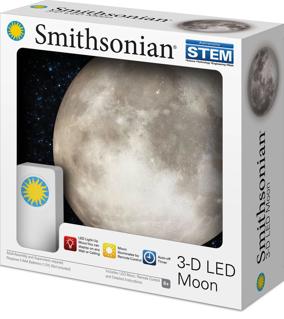 This Smithsonian Glowing 3-D Moon Kit lets you turn your child's room into a planetarium and provides a fun way to teach them about Earth's moon. Charges with any light. Glows in full spectrum color. Kit includes: moon with 1 hook, clear string for hanging and detailed instructions. Scissors are required and not included. Adult assembly and supervision required.12.87 L x 8.9 W x 9.75 H, Batteries Required