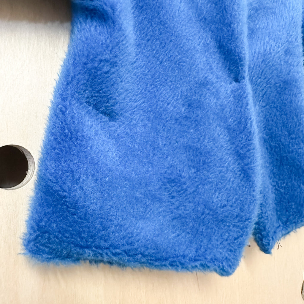 Vintage bright blue fuzzy jacket, light weight, unlined and shorter sleeves.