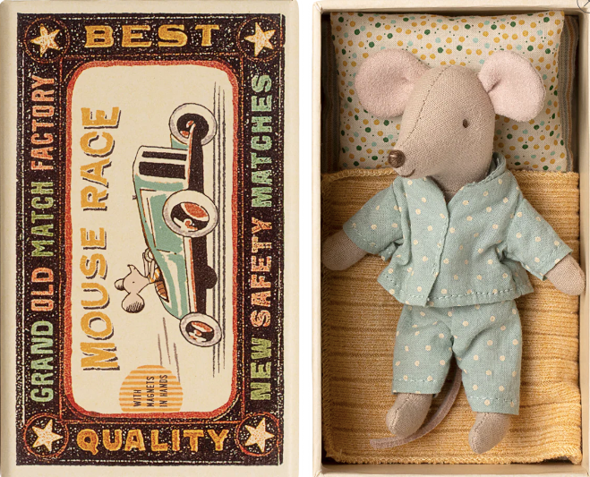 A Maileg favourite, this Little Brother Mouse comes tucked inside his very own matchbox bed. Dressed in cosy pyjamas, he rests on a soft blanket with a little pillow, ready for sweet dreams. When he wakes, he is all set for hours of play before curling back up in his box at bedtime.