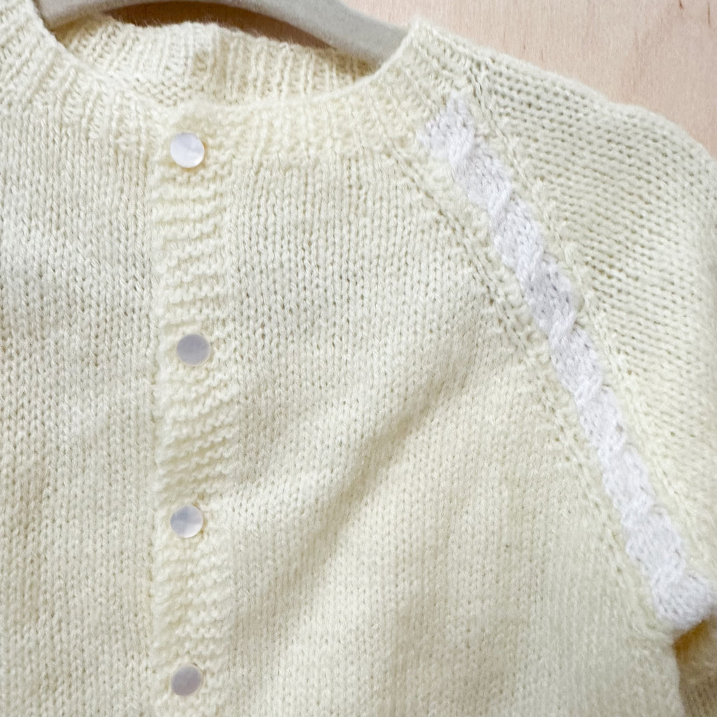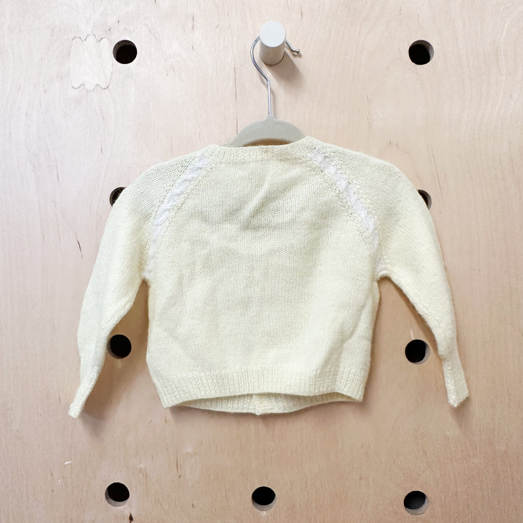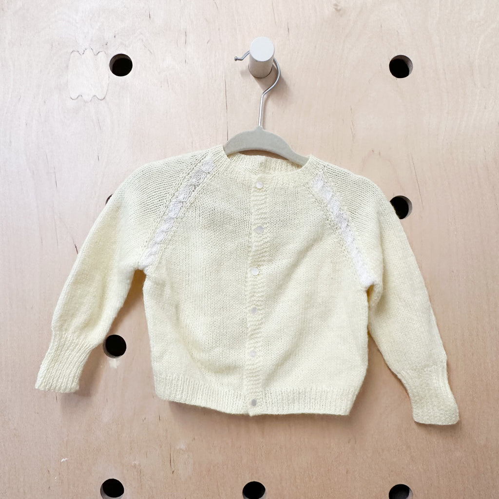 Vintage white and pale yellow wool cardigan with cable knit details.