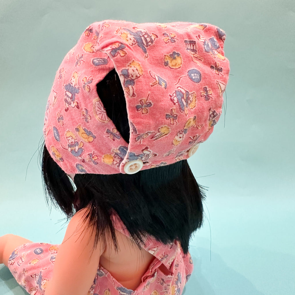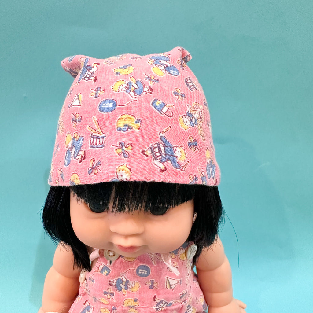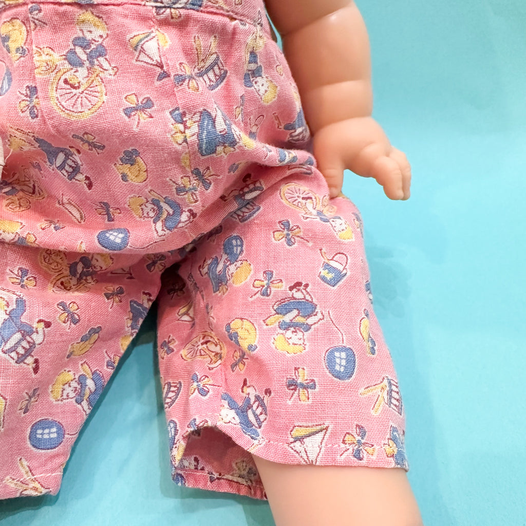 Vintage 1940s novelty printed pink doll jumpsuit with a matching bonnet outfit set.