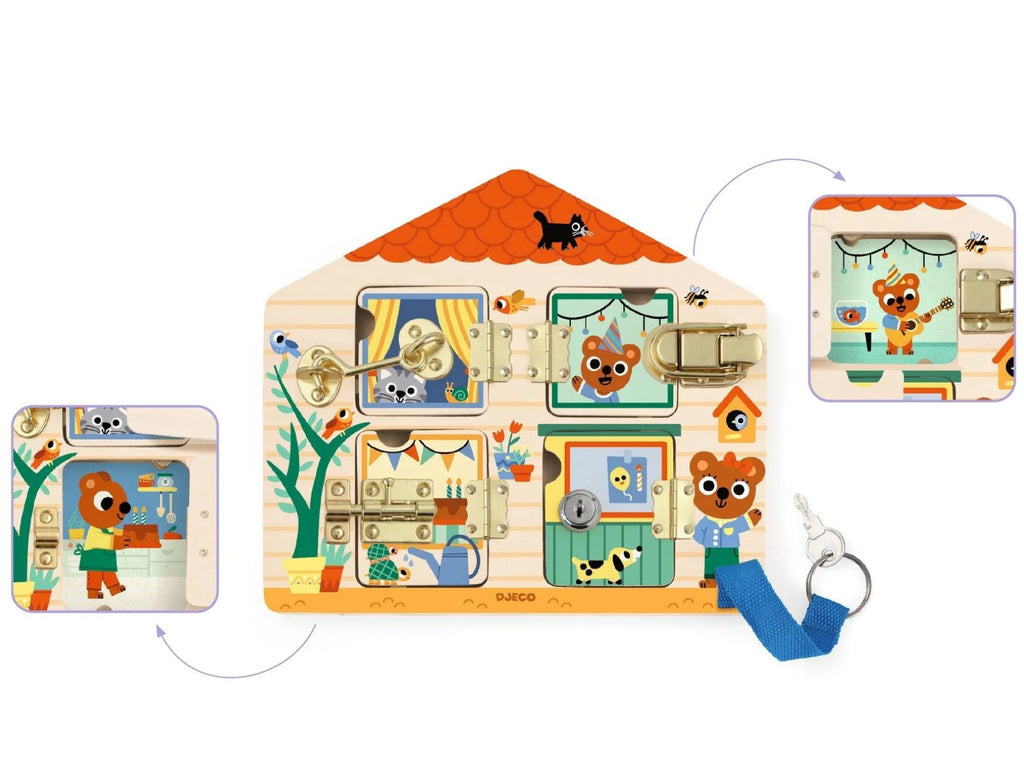 A house-shaped dexterity game where children learn to open and close locks. Discover the little cat’s birthday party in pictures. For ages 3 and up, Cabanalock supports your child in the early learning stages.