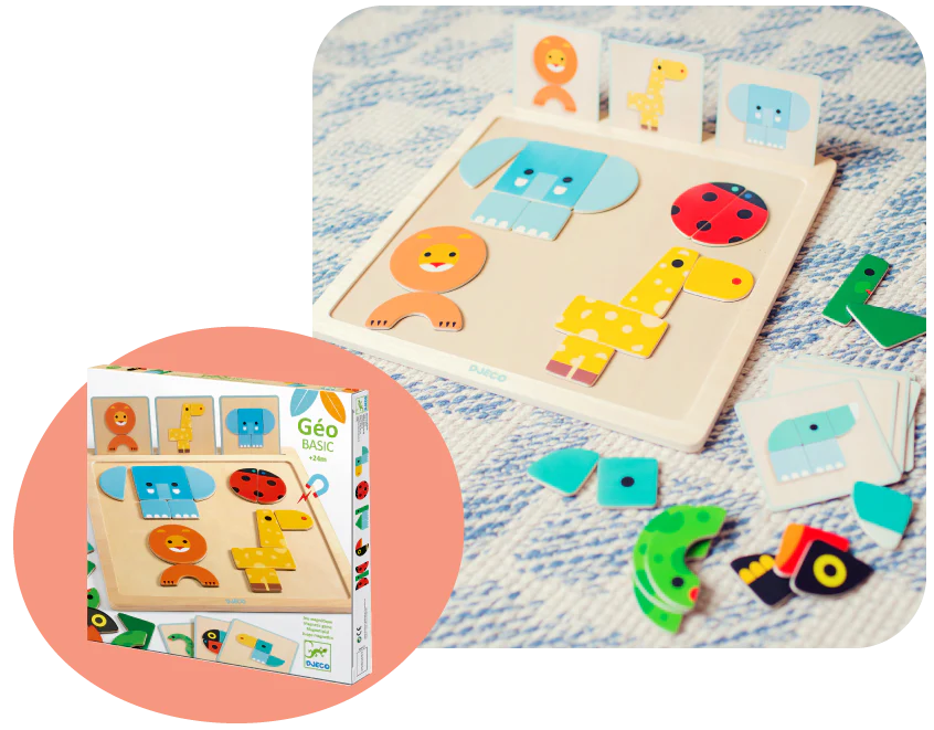 A uniquely beautiful 32-piece magnetic puzzle; can you build the 16 different animals and wacky characters? Choose one of 8 double-sided cards and try to recreate the character with the 24 magnetic pieces, stick the pieces on the 12 x 12 inch magnetic board.