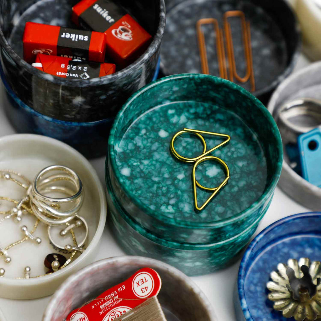 A small circular stackable tray made of melamine by Hightide. A new addition to the family of marbled surface melamine trays, available in six sophisticated colors. The stacking trays can be stacked in multiples as well as with the medium stacking trays of greater height. Stack or mix and match with other circular or rectangular trays to tidy up as well as showcase small accessories, paper clips, wrapped candies, cosmetics, and daily essentials like watches and keys. Please note that the trays are not food safe. Dimensions: (Ø)2.8” x (H)0.8”