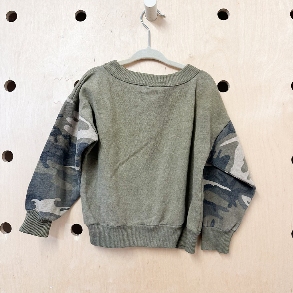 Vintage camo and jet plane graphic sweatshirt.