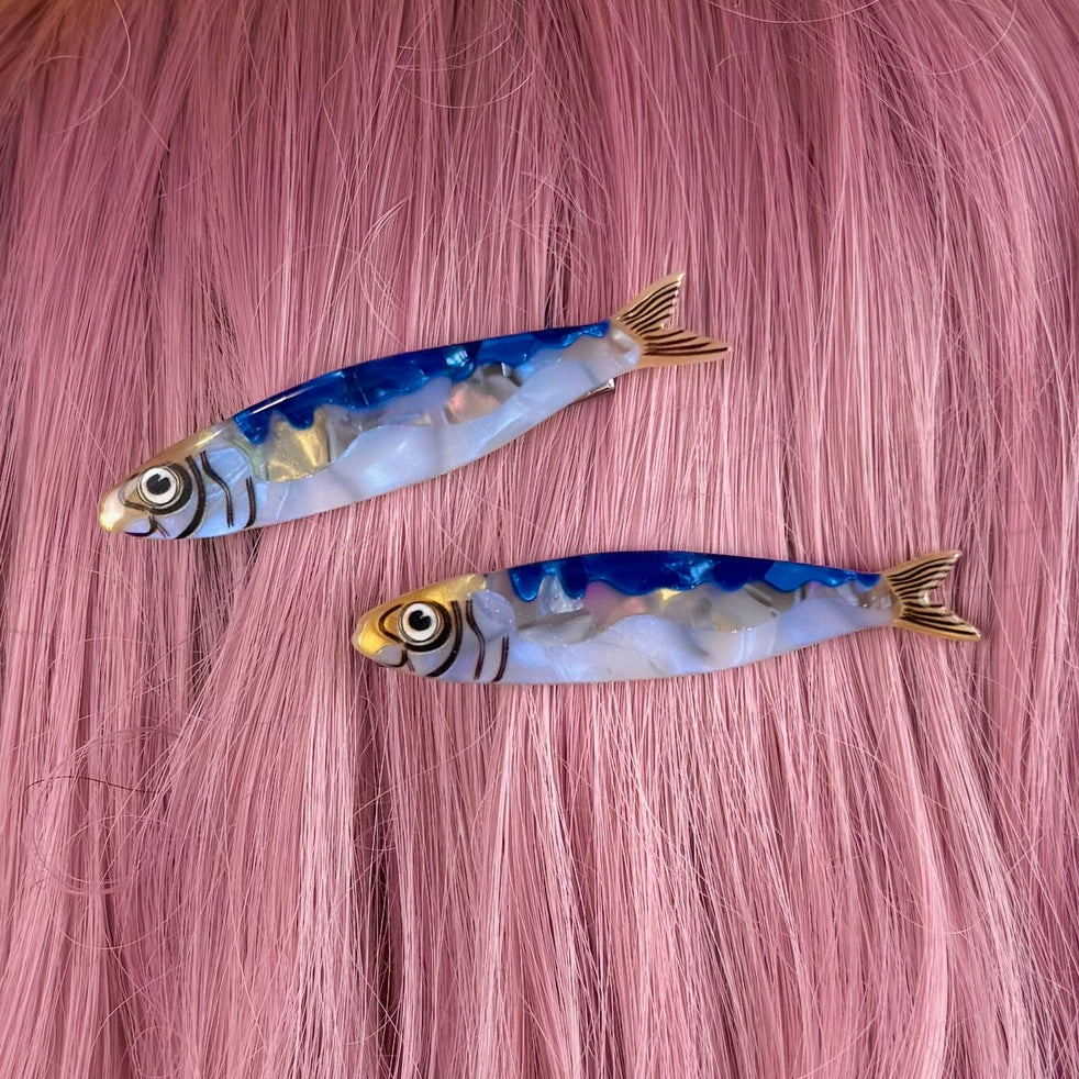 Two snackable sardines in a tin — for your hair, not your pantry. Packed just right. This set of two glossy barrettes is finished with sardine details and tucked inside a custom MackBecks sardine tin for the full top-shelf treatment. These barrettes are snack-inspired but thoughtfully constructed — with steel alligator clips designed to hold without slipping. Whether worn together or styled solo, they add a polished touch to any look.