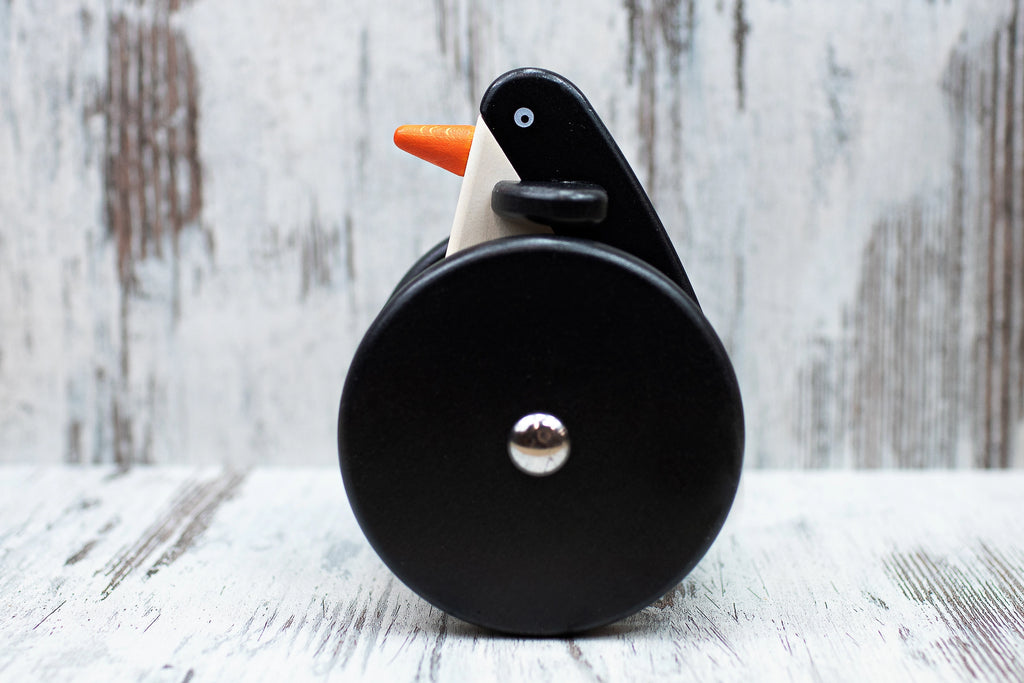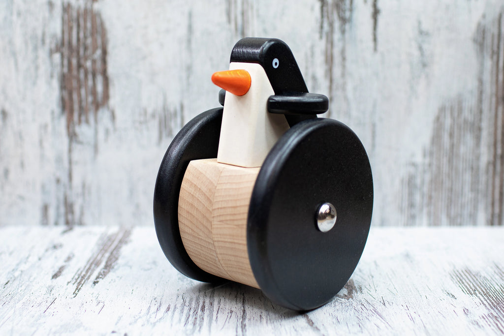 Adorable, wobbling wooden penguin. It's made of a beautifully crafted and soft stained wood. It's heavy enough to steadily wobble back and forth and remain standing upward. The bird can easily turn around on itself. It's great yet simple entertainment. This wobbling penguin is apart of our toy collection for tiny people, but it can be used by teens and adults alike.